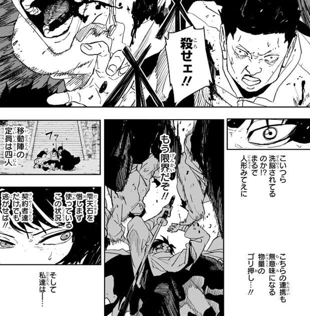 そうしている間にも座村が敵の妖術師を次々と倒していきますが、雫天石を持った妖術師はまるで洗脳されているかのようにゴリ押しで攻め込んできます。連携も無意味になる物量のゴリ押しを続けられると、座村や漆羽、巻墨といえども限界が近いようです。しかし、敵は雫天石を惜しまず使っているので、移動陣を使って契約者達だけでも先に逃がせば大きな戦いも一区切りつき、ハクリを十分回復させる時間も出来る、と女の巻墨は考えていました。