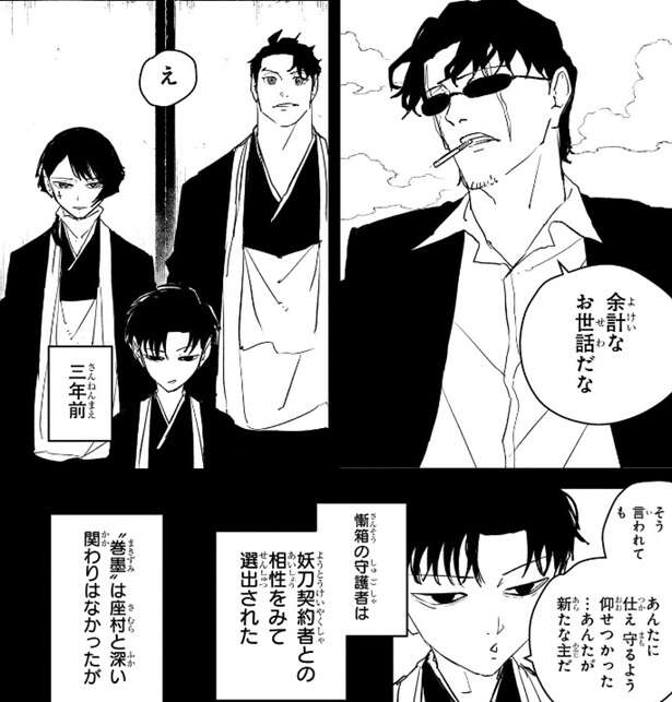 巻墨は数百年続く忍の一族で、斉廷戦争でほとんどが命を賭し役目を終えて、その末裔は戦後も主を守る道具として神奈備に仕え続けました。今の巻墨が座村に仕えるようになったのは三年前で、慚箱の守護者として座村と出会います。慚箱の守護者は妖刀契約者との相性で選出されますが、巻墨は座村と深いかかわり合いはなかったようですが、唯一共闘が可能なのが巻墨と判断されたようです。しかし、座村は巻墨の三人に余計なお世話と言い放ちます。