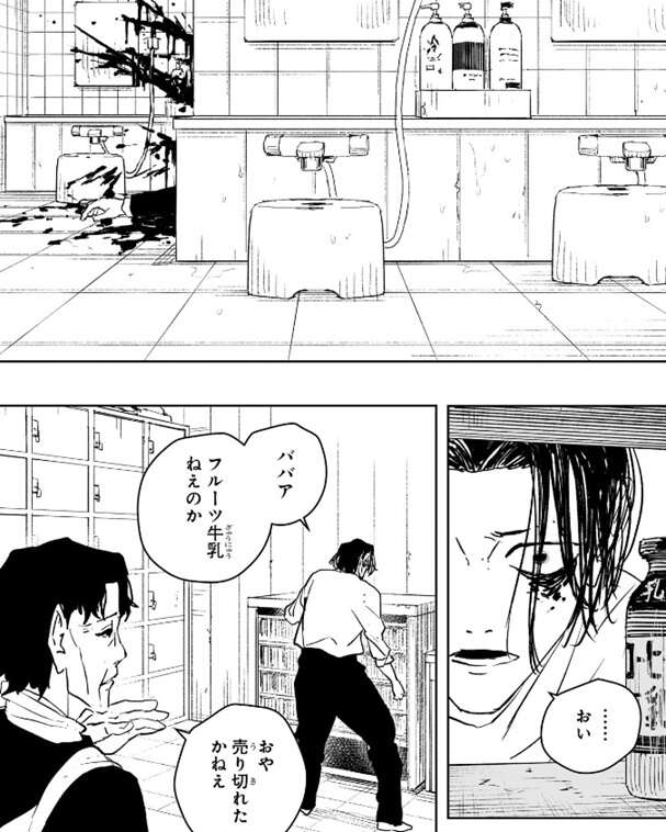 結局、スーツ姿の男二人は双城にあっさりと殺されてしまいます。風呂から出た双城はフルーツ牛乳を飲もうとしますが、売り切れでこれまたついていません。