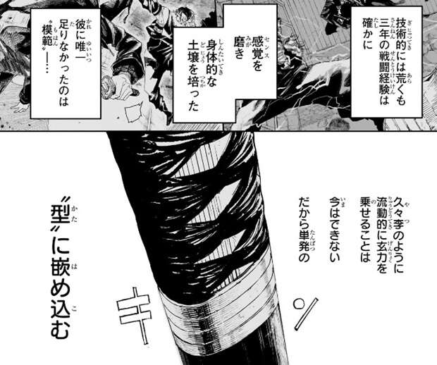 チヒロは久々李の刀を受け続けただけで、刀を握っていた左手が痺れていて、久々李との剣術の腕の差を痛感します。ずっと妖刀に頼ってきたツケだ、とチヒロは反省し、久々李が言う通り一朝一夕では到底無理ということも実感していますが、それでも持っている刀を鞘に納めると何かを試そうとします。久々李のように流動的に玄力を乗せることは今のチヒロには無理ですが、単発の“型”に嵌め込むやり方をチヒロは試そうとします。