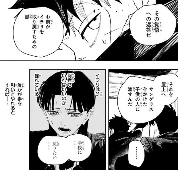 井倉の覚悟を聞いたチヒロは封印に必要な鍵を渡すと、それを屋上へ持っていきサングラスをかけた子供の人に渡すように言います。チヒロはイヲリが今何者でいればいいのか揺れている事に気付いていて、誰かが手を引いてやれるとすれば、井倉かもしれないと考え鍵を渡します。