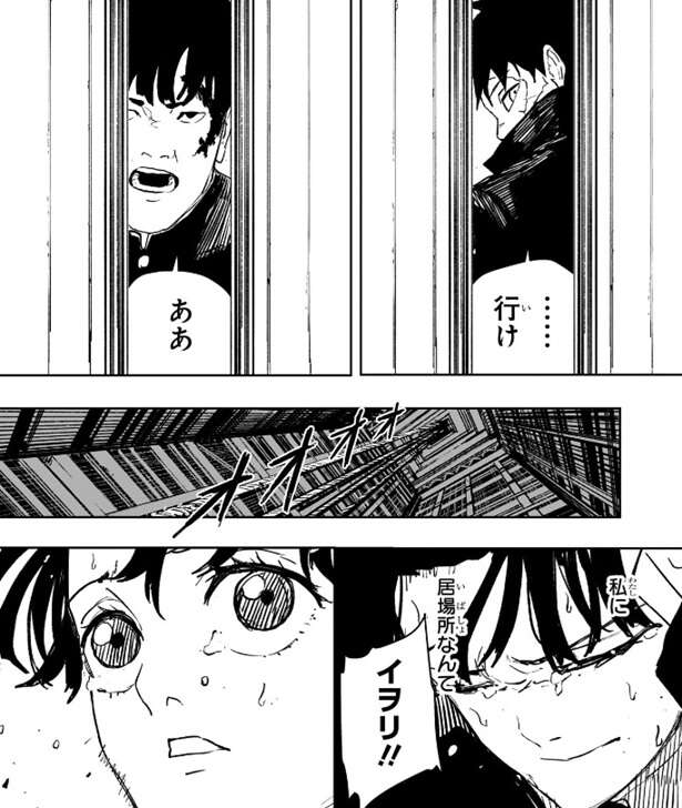 チヒロに、……行け、と言われ、井倉は、ああ、と答えるとエレベーターで屋上へと向かいます。一方、屋上のイヲリは、私に居場所なんて、と悩み続けていましたが、井倉がイヲリの名前を叫ぶと、井倉の方を振り返ります。
