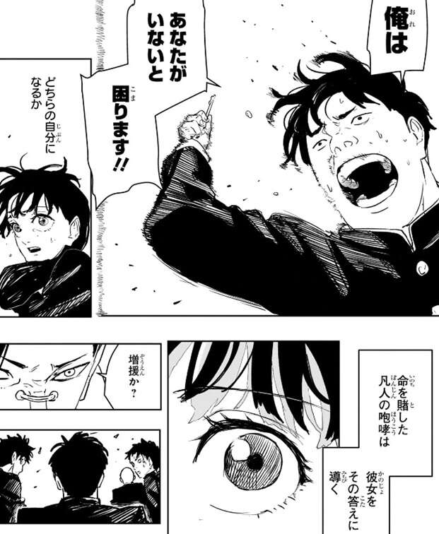 井倉は、俺はあなたがいないと困ります!!と、正気を失った宿泊客達がいる危険な状況の中でイヲリに叫びます。命を賭した凡人の咆哮は、彼女を『学校生活(へいぼん)を守りたい』という答えに導きます。一方、宿泊客達は井倉に気付き、増援と思ったようで襲い掛かります。巻墨も井倉に気付きますが他の宿泊客の相手で手一杯で、井倉に襲い掛かる宿泊客達を止められません。
