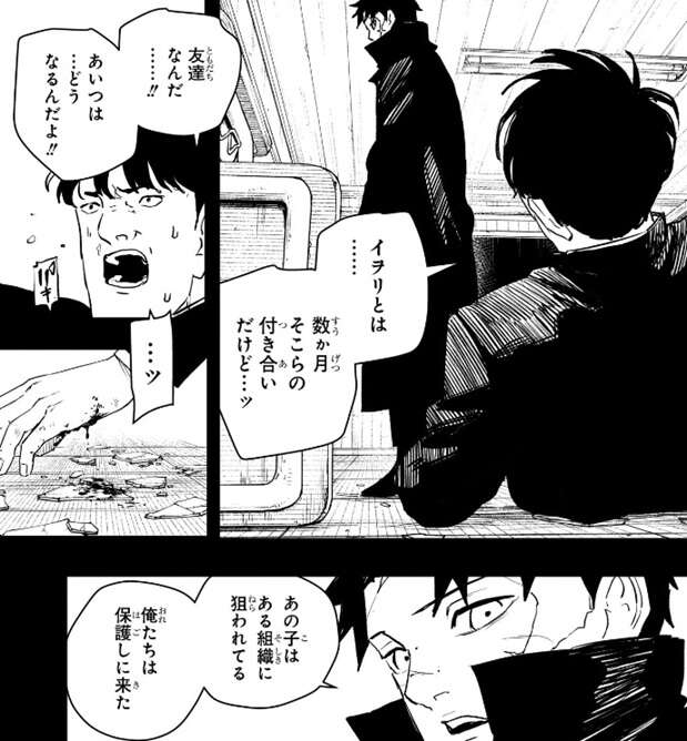 井倉はイヲリがどうなるのか気にしますが、チヒロはイヲリがある組織に狙われていて俺たちで保護しに来た事、彼女の安全は保障するのでそれ以上血を流したくなければじっとしているように井倉に言います。