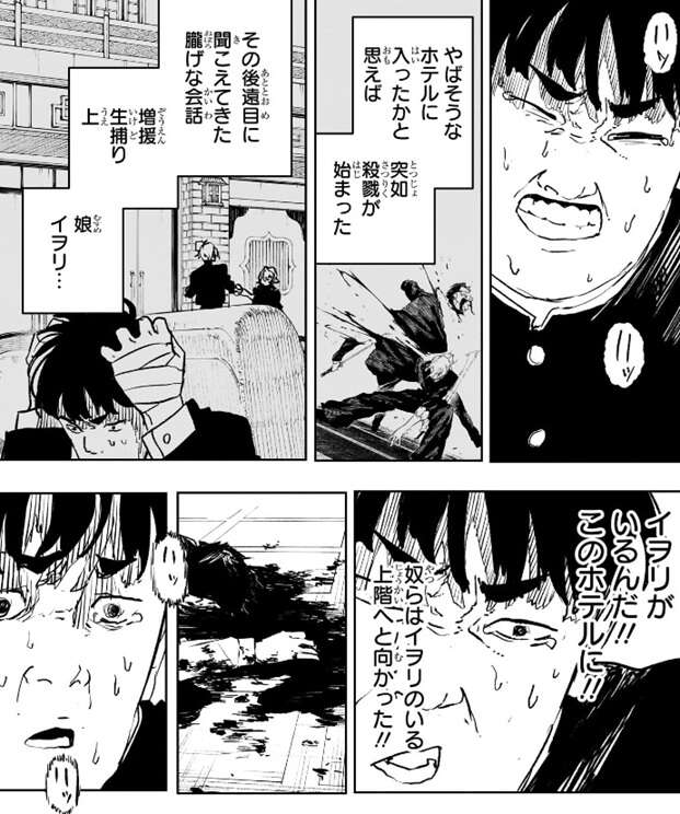 しかし、井倉はイヲリを放っておけずチヒロの忠告を無視して、京都の中で物騒な一帯を一晩中探し斗斗を見つけます。そして、斗斗の後をつけて行き京都殺戮ホテルに侵入しますが、いきなり昼彦の殺戮が始まってしまい、井倉は恐怖で身動きが取れなくなります。しかし、毘灼の会話からイヲリがこのホテルの上階にいる事を知りますが、井倉は倒れた人の血を見てチヒロの忠告を思い出します。