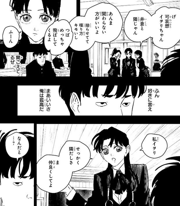 それ以上血を流したくなければじっとしておくんだ、というチヒロの忠告、さらに保健室で傷の手当てをしてもらった時、保健室の養護教諭から、襲撃した人はいかにもやばそうだからしかるべき機関に任せて関わらない方が身のためだよ、と言われた事を思い出します。それでも井倉はイヲリと最初に出会った時の事を思い出します。この頃の井倉は色々と中二病を拗らせていたようで、学校では井倉を無視するというセオリーが出来上がっていたようですが、イヲリはせっかく席が隣だしさ、仲良くしてよ、と話しかけてきました。井倉はセオリーを安易に破ってきたイヲリを認め、孤高を捨てて、よろしくお願いします、と返事をします。