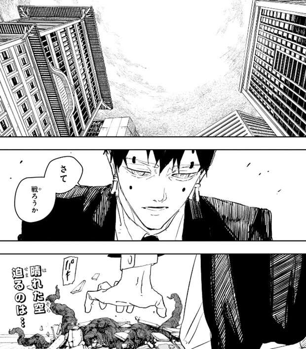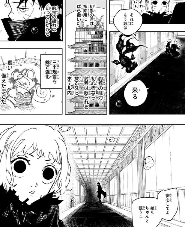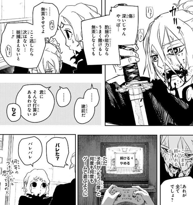 斗斗も昼彦を説得する事は諦めたようで、やれやれとあきれます。その後ろでは黒い金魚が現れ、昼彦もチヒロが来ることを察知します。初手の涅は探索用にばら撒いていて、チヒロは酌揺の能力を知っていたようです。酌揺の能力は使い手によって射程が異なるようで、初心者だと建物一つ程度のようです。チヒロは三半規管を錦で強化して幻覚に備えていて、昼彦と斗斗のいる通路に現れます。昼彦が斗斗に、安心してよ、娘もちゃんと狙うし次は勝つよ、と言った後、チヒロが昼彦に襲い掛かり、二人の戦いが再度始まります。