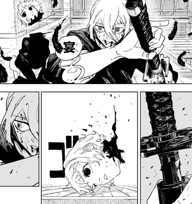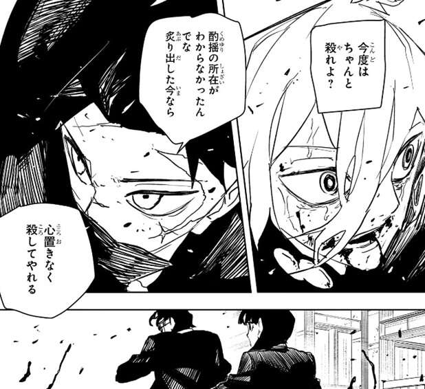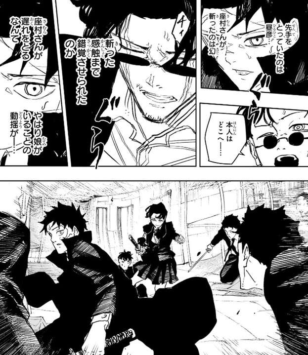 昼彦は座村にとって娘がいるこの状況はイレギュラーだから少なからず動揺があるはずと考え、斗斗にイヲリを捕えるように言います。そして、昼彦は酌揺の能力『宴』を使って座村に対応しようとしますが、それよりも早く座村は斗斗の首を斬り落とします。