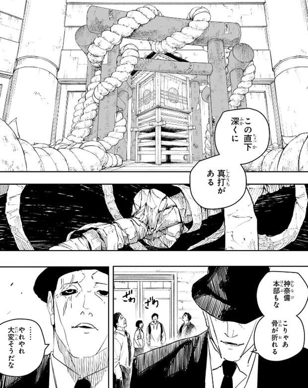 一方、東京では幽と毘灼の妖術師が会話をしていました。座村清市は毘灼にとって最も強力な武器で、上手く操って十分な利益と引き換えに壊さなきゃならない、と幽は言います。その運命を決定づける鍵の一つが娘の存在のようですが、幽は京都の攻防次第では二の矢を放つ準備をしていました。幽と毘灼の妖術師が会話をしている直下深くに真打と神奈備本部があるようで、幽と毘灼の妖術師はそこを襲うようです。
