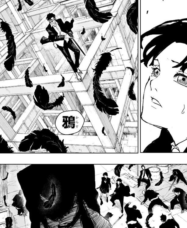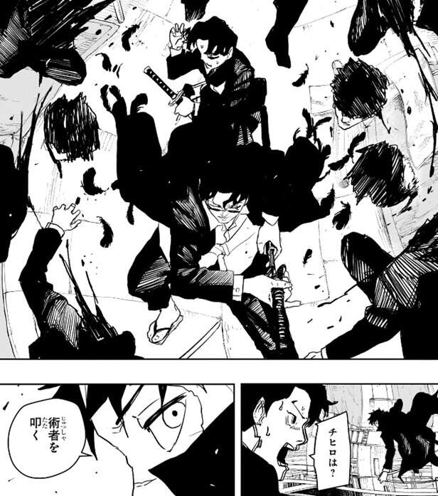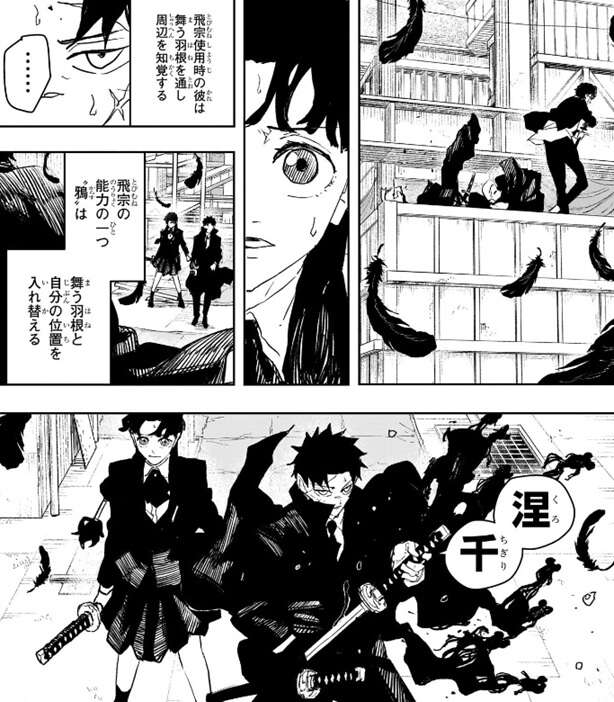 飛宗使用時の座村は舞う羽根を通して周辺を知覚し、さらに『鴉』を使用していると舞う羽根と自分の位置を変えられるようです。一方、チヒロも涅・千を使用して、座村に一方的にやられないように斬撃を放とうします。座村は郎に封印を解いたのかと聞きますが、郎はイヲリが自力で解いたと答えます。それを聞いた座村はもう一度封印するように言いますが、久しぶりに会った娘にかける言葉もないの?とイヲリは言い、私ずっと……お父さんのこと…、と叫びます。