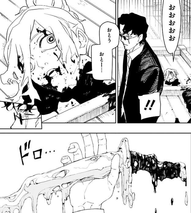 すると、首を落とされて死んだはずの昼彦が、おとう、おとー…、と座村に話しかけて、座村の持っている刀が溶けていきます。