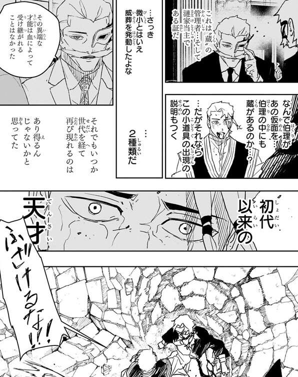 ハクリは柴に教わった通り、自分に宿った能力の輪郭、そして全容を掴むために意識を内側に向けます。するとハクリは威葬だけでなく、もう一つの能力が自分の中にある事に気付きます。その能力は“蔵”で、ハクリは “蔵”と“威葬”の2種の能力を併せ使える漣家・初代当主以来の天才だと判明します。ハクリの才能に気付いた宗也は、ハクリに激怒し殺そうとします。
