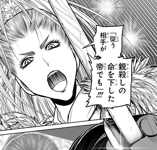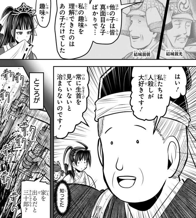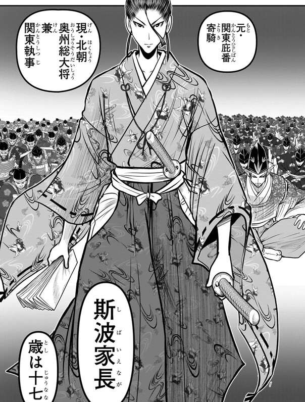 利根川の戦に大勝利した時行は、顕家に顕家軍の将達を紹介してもらいます。執事の春日顕国と指揮官の伊達行朝は常識人で、時行を歓迎します。しかし結城宗広は一見常識人に見えますが、実は保科党にいたシリアルキラーの結城三十郎の父親で、この結城宗弘も三十郎と同様、重度のシリアルキラーでした。さらに南部師行もあからさまに時行を馬鹿にする、癖の強い人物です。弧次郎は南部の失礼な態度に腹を立てますが、時行は尊氏を倒す為と顕家軍の将と一から信頼を築いていこうと心に誓います。