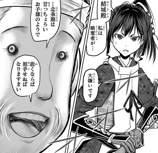 顕家軍は京を目指して進軍しますが、関東足利党の残党の待ち伏せに遭い進軍速度が上がらず兵糧不足に陥っていました。仕方なく食料を現地調達しようとしますが、顕家軍の結城宗広は現地で大規模な略奪に及んでしまいます。略奪が大嫌いな時行は結城を止めようとしますが結城は時行に剣を向け、結城と時行は一瞬即発の状態になります。
