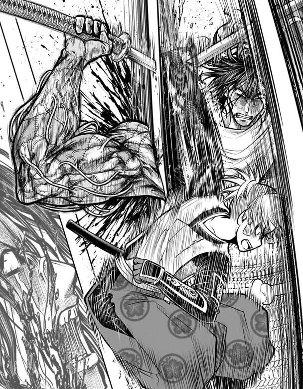 長尾に吹っ飛ばされた弧次郎ですが、空中で体勢を立て直し再び長尾に斬りかかります。長尾は大太刀で応戦しますが、弧次郎は護身用の打刀で防ぎ空中でさらに回転すると、もう一度斬りかかり長尾の腕を斬り落とします。