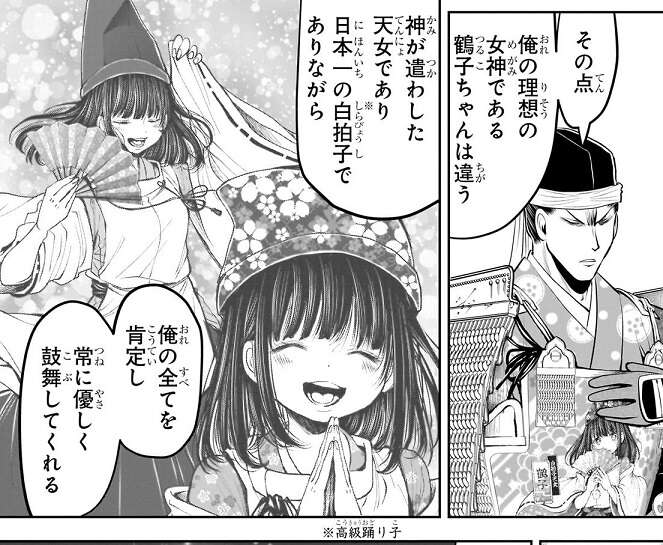 石塔は亜也子と戦いながら、彼女に質問攻めをします。石塔には理想の女神である鶴子ちゃんが脳内にいますが、亜也子の長所を取り入れてより鶴子ちゃんを魅力的にする為に、亜也子を質問攻めにしていました。岩松と一騎打ちをしていた望月は、岩松が持つ異形の大刀「艶喰」に苦戦していました。「艶喰」は元寇の際に手に入れた敵の武器の特徴を取り入れており、望月の武器は「艶喰」にすぐにへし折られてしまいます。