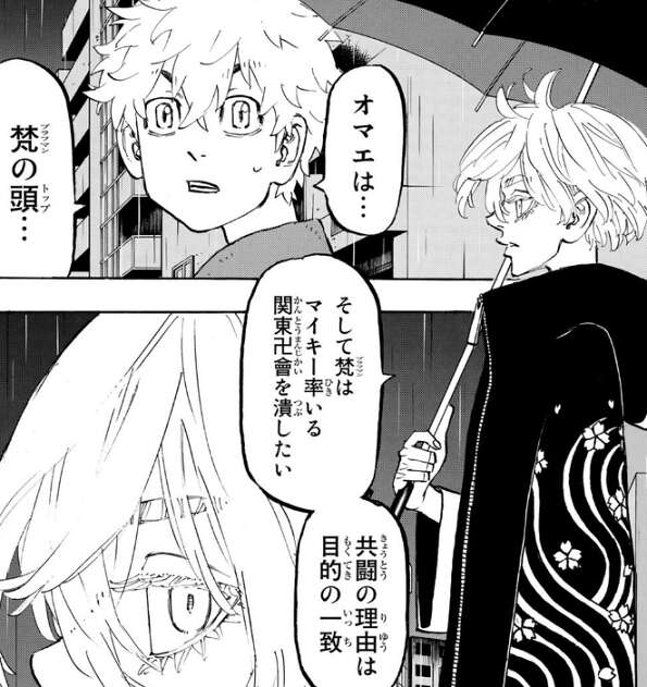 ドラケンが梵(ブラフマン)のメンバーと知り、武道はドラケンに梵(ブラフマン)に入った理由を聞こうと思います。しかし外に出てみると、ドラケンは明石 武臣と武道をスカウトした件について揉めていました。ドラケンは武道を梵(ブラフマン)にスカウトすることに反対ですが、それでも瓦城 千咒は武道を勧誘しようとします。
