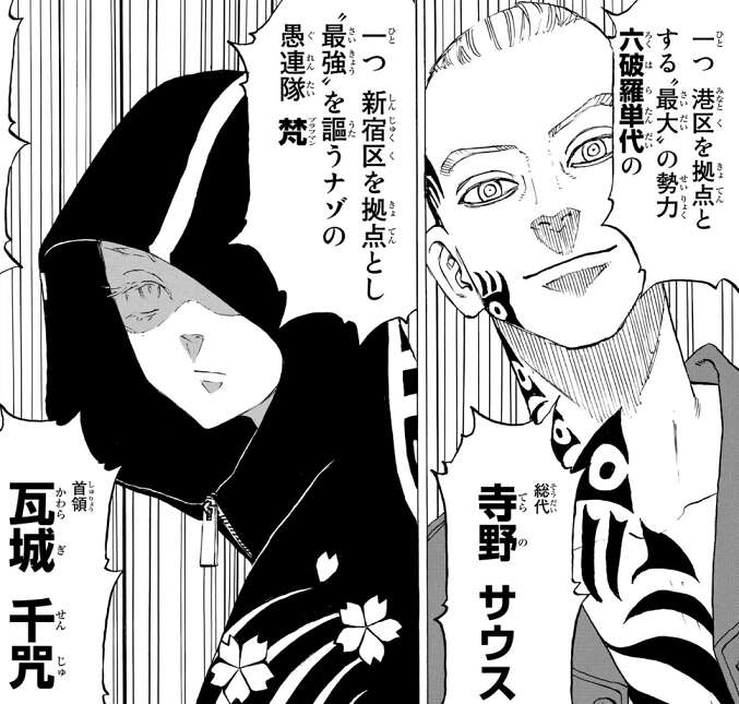 東卍解散後のマイキーの様子を知らない武道は、不良界隈に詳しい山岸に東京の不良について説明してもらいます。東京は現在三つ巴の均衡状態になっていて、港区を拠点とする最大勢力の六波羅単代、総代は寺野 サウス、新宿区を拠点とする愚連隊 梵(ブラフマン)、首領は瓦城 千咒、そして渋谷区を拠点とする関東卍會、総長は佐野 万次郎、この3チームによる“三天時代”になっている、と山岸から聞かされます。