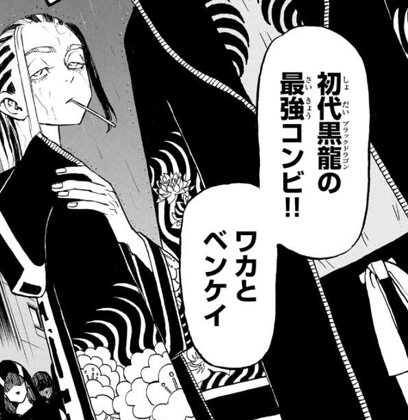 梵(ブラフマン)の首領・瓦城 千咒に絡んできた班目を、梵(ブラフマン)の大幹部・荒師 慶三は一撃でのしてしまいます。さらに、梵(ブラフマン)の大幹部・今牛 若狭も現れると、武道は荒師 慶三と今牛 若狭は初代黒龍の最強コンビだと、イヌピーから教えられます。