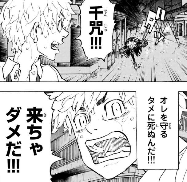 武道は六破羅単代の銃弾から千咒を守ることに成功しますが、ドラケンが身代わりに六破羅単代の銃弾を受ける形になってしまいます。武道はドラケンに少し先の未来のヴィジョンが見えることを伝え、ドラケンのおかげで千咒が死ぬはずだった未来が変わった、と武道はドラケンに言います。
