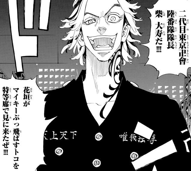 柴大寿は三ツ谷に勧誘されて、陸番隊隊長として二代目 東京卍會に参加していました。大寿は武道のためにマイキーまでの道を作ると言うと、関東卍會のメンバーをほとんど倒していき、一人で形勢逆転させます。勢いに乗って次々と倒していく大寿ですが、ブラックドラゴンの大先輩、今牛若狭と荒師慶三のコンビが大寿の行く手をふさぎます。
