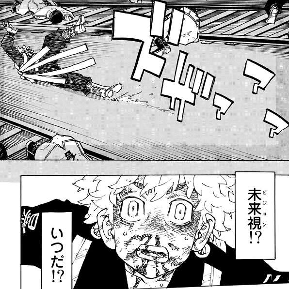 一瞬先の未来が見えるようになり、武道は進化した未来視(ビジョン)を使うことで、マイキーの攻撃を見切ることに成功します。武道は何度もマイキーの攻撃を見切ってかわす事で、マイキーの動揺を誘います。そして、ついに武道はマイキーに一発、パンチを入れてぶっ飛ばすことに成功します。