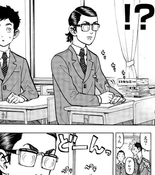 松野千冬が場地と出会った時の話、千冬がまだ中学1年の頃、3組にダブっている奴がいると聞き、中学でダブる奴だから超ヤベぇ不良だと思い込み、デケぇ顔する前にシメ行くか!と、3組に殴り込みにいきます。そのダブった奴が場地でしたが、場地は何故か髪ぺったりのメガネの格好をして国語辞典を引いていました。