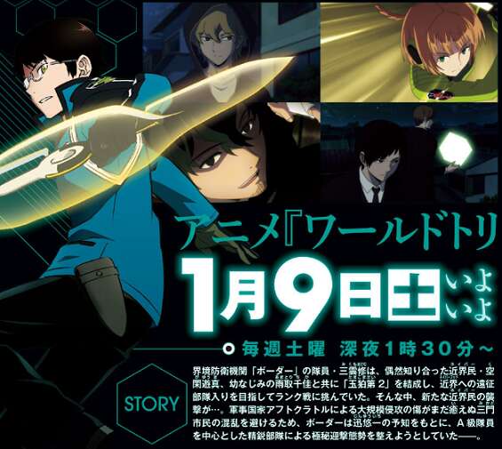 1月9日からTVアニメ「 ワールドトリガー 」2ndシーズンが始まります。原作のどこまでアニメ化されるかですが、ガロプラ侵攻からなので14巻の途中から始まります。そこから2期はB級ランク戦最終戦の22巻か23巻まで、アニメ化はされるのでは?と推測しています。