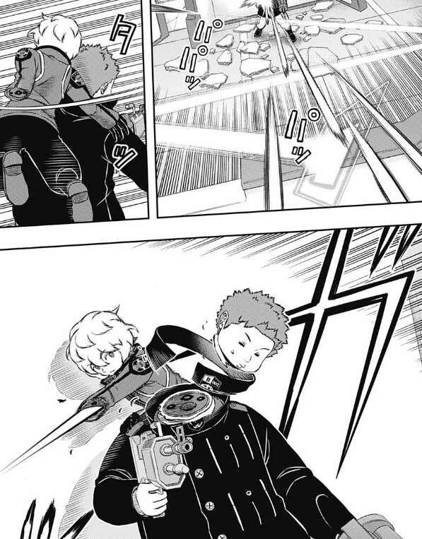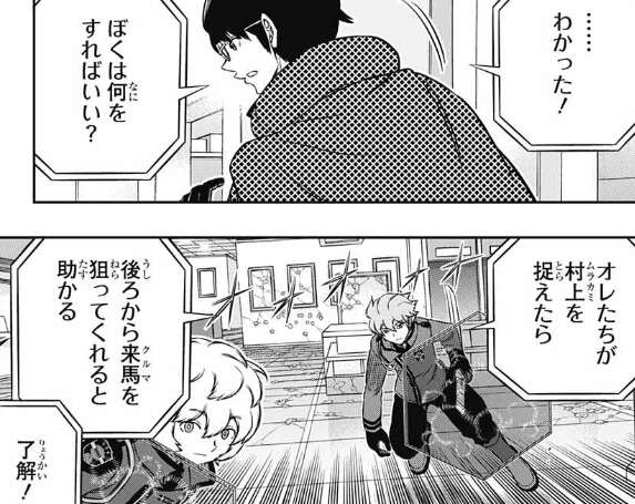 三雲はこの場でアステロイドと思わせて、バイパーを今度こそ撃つと思いますが今度もまっすぐしか撃たず、鈴鳴第一と打ち合いになります。三雲はヒュースに何故、弾道変化を使わないのか聞きますが、ヒュースは理由を言わずこの試合は「曲がる弾」は撃たないと言い、鈴鳴第一は別の手で倒す、理由は試合の後で説明すると言います。