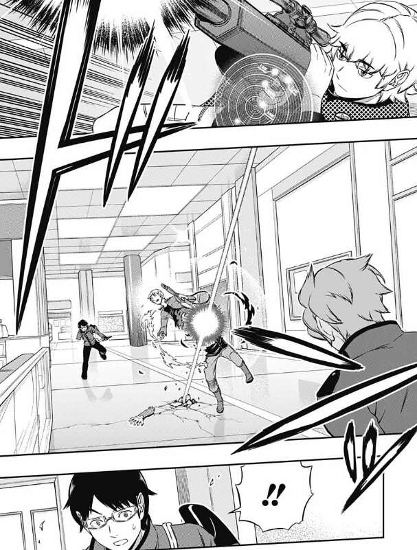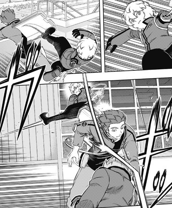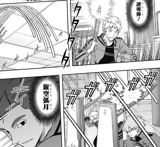 ここで2対1の状況になったヒュースと空閑は、村上を攻撃します。状況的に村上はヒュースか空閑、どちらかの攻撃は食らう形になりますが、村上は旋空弧月を器用な形で使用し1アクションでヒュースと空閑、二人を斬ろうとします。空閑は村上の攻撃で左腕を失ってしまいます。