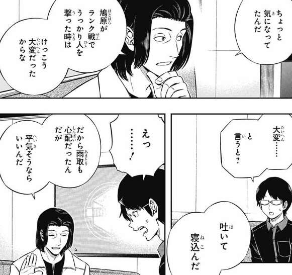 東の心配には、以前は元二宮隊の鳩原がランク戦時にうっかり人を撃ってしまい、履いて寝込んでしまった事があるようです。雨取と違ってそこまではっきりと拒否反応が出ることに驚いた三雲は、鳩原が「相手の武器だけを狙って壊す」タイプだったのではと聞きますが、失敗は1回のみだと東はは言いそれ以外は一度も人には当てていないそうです。
