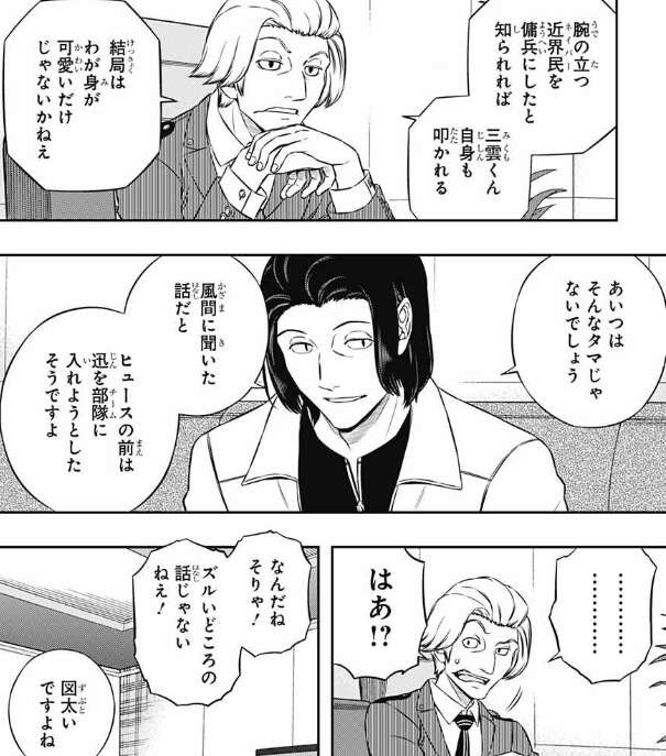 三雲を評価する東に、根付は結局わが身可愛さではないかと言いますが、過去に三雲はヒュースの前に迅をチームに引き入れようとしていた言うのを聞き、その図太さに呆れます。