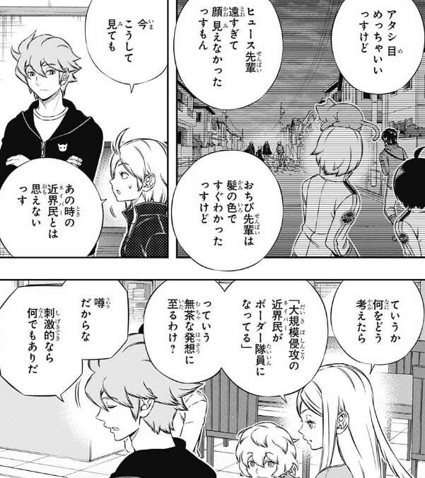 玉狛支部に戻り、全員とヒュースの噂の話になりますがどうやら特に根拠があるわけでもなく、C級隊員の誰かが軽いノリで言った話に火がついて広まったようです。実際、アフトクラトルの大規模侵攻時のヒュースは、C級隊員からは遠すぎて姿が分からなかったはずだと夏目が証言しています。
