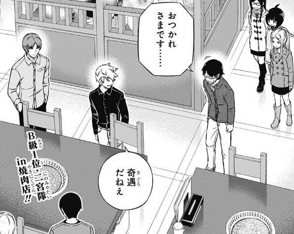 そして最終戦の対戦相手も決定し、お肉を食べに玉狛支部の四人で外食に行きますが、そこでB級1位・二宮隊とまさかの鉢合わせとなります。