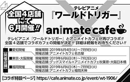 TVアニメ「ワールドトリガー」とアニメイトカフェが再び、コラボするそうです。6月に全国4店舗にて開催予定です。東京、大阪、愛知、福岡地区にお住まいの方は、ぜひアニメイトカフェにぜひ行ってみて下さい。