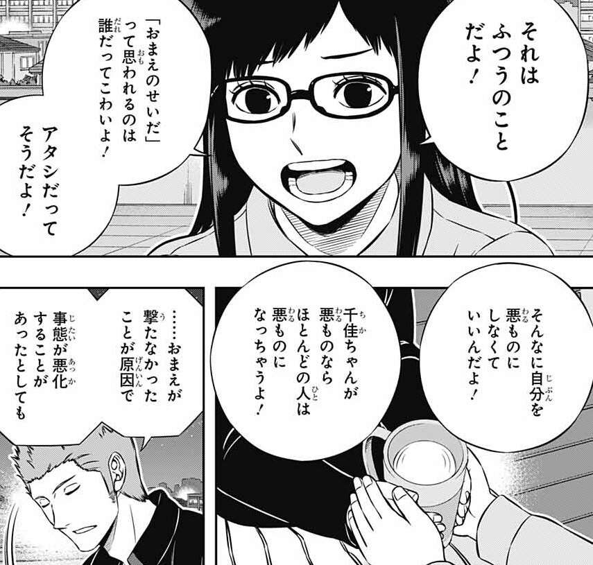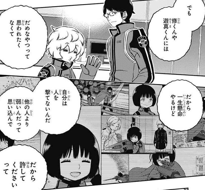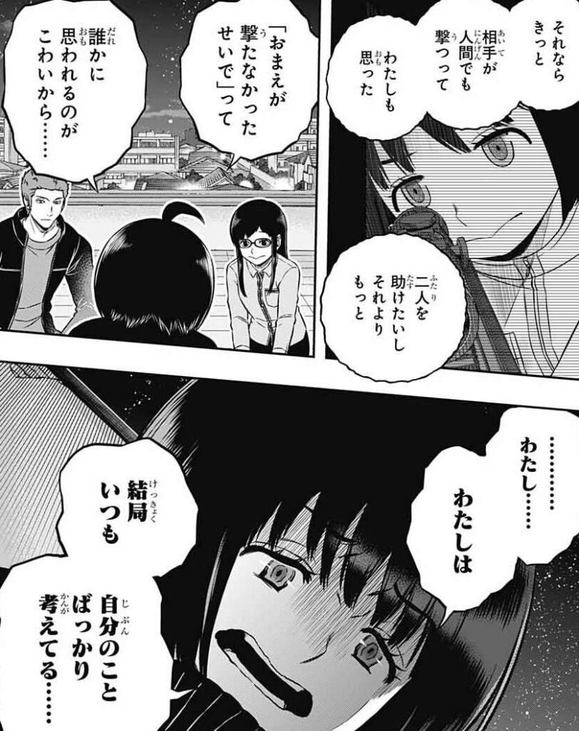 雨取は実は人を傷つけるのが怖いのではなくて、誰かに責められるのが怖いと自己分析します。しかし三雲や遊真からだめなやつと思われたくなくて、一生懸命やり始めますが、結局自分は人が撃てないから許してください、と思います。