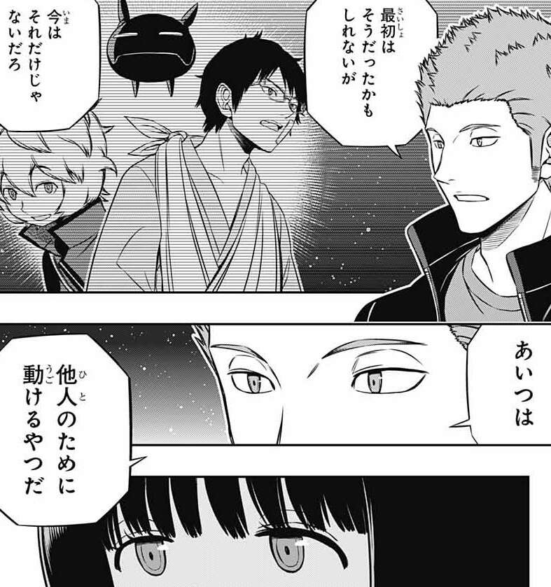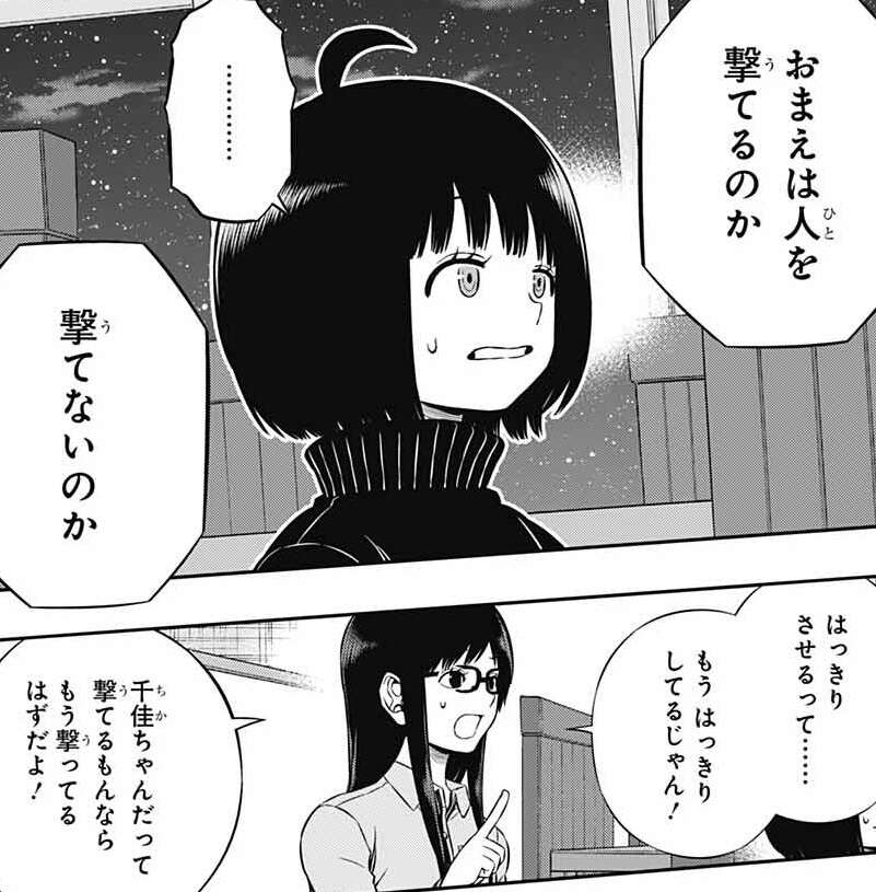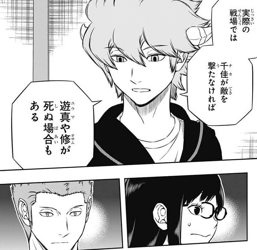 レイジがヒュースに雨取が人を撃てると考える根拠を聞きますが、根拠はないとヒュースは言い戦場での経験則から雨取は「打てる側」の人間だと感じているようです。雨取は自分が人を撃てない理由を、自分の手で相手が傷つくのを見るのがこわいからと、自己分析しますが、ヒュースは納得しません。実際の戦場での例を出し、雨取が撃たなければ遊真や三雲が死ぬ場合もあると言います。