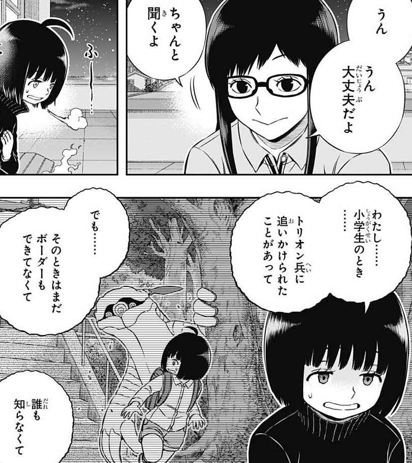 場所を移して雨取を落ち着かせますが、雨取は自分の想いを話し始めます。自分が小学生の時、トリオン兵に追いかけられますがそのときはまだボーダーという組織もなく、誰にも頼れません。