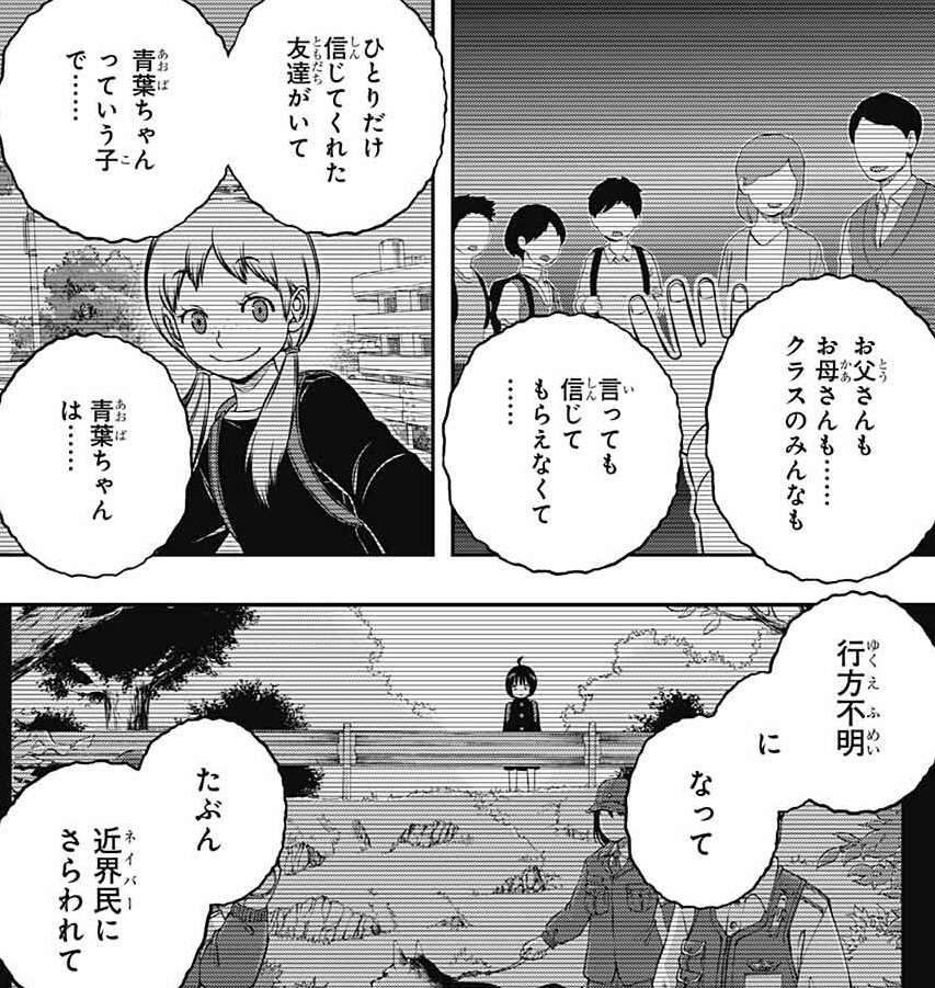 父親、母親、他大人に言っても信じてもらえませんでしたが、友人の青葉という子だけは信じてくれます。しかし青葉は行方不明になってしまい、雨取はネイバーにさらわれたと推測します。その時から雨取は自分の言う事を、周りが信じ始めたのが怖かったと告白します。青葉がいなくなったことは、雨取が巻き込んだせい、というのが周りに知れることを雨取は怖くなります。