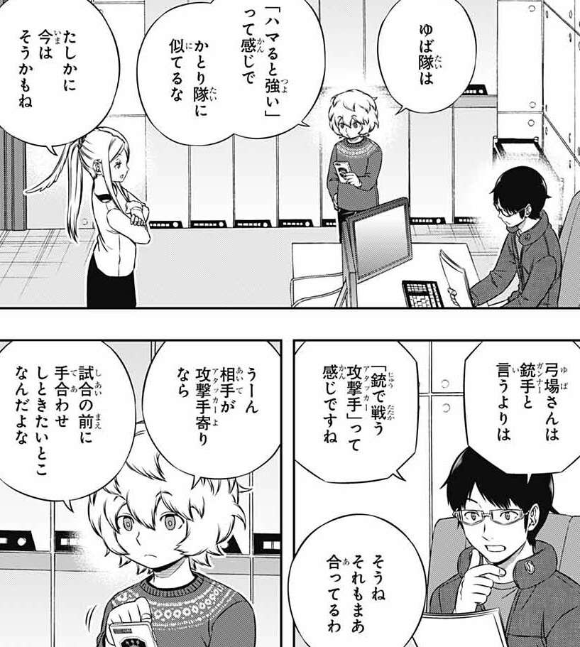 場面変わって、三雲と遊真は最終戦 ROUND8対策をオペレータールームで考えています。三雲の分析では弓場は銃手というよりは、銃で戦う攻撃手と考えています。遊真は相手が攻撃手よりなら、生駒の時ようにやられたくないので試合前に手合わせをしたいと言います。