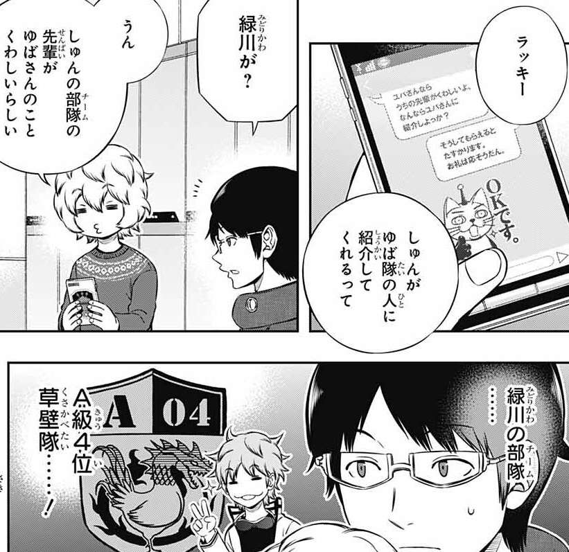 そう考えていた遊真の所に、緑川から弓場隊の人を紹介してくれると連絡が入ります。遊真は緑川のチーム、A級4位の草壁隊の先輩が弓場の事に詳しいらしく明日、緑川の先輩と弓場に会えることになりそうです。
