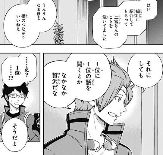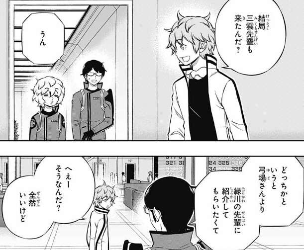 里美に礼を言い別れた後、三雲は偶然迅と通路で会います。最終戦に向け里美に二宮の事を聞いていたと三雲が言うと、1位に1位の話を聞くのはなかなか贅沢だと迅から言われます。
