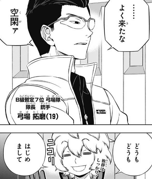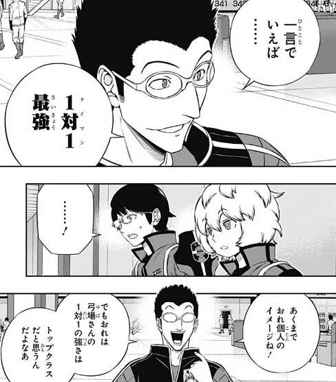空閑は里美に弓場がどんな人か質問すると、戦力(ウデ)的に一言で言えば1対1(タイマン)最強な人物だと教えてもらいます。弓場の1対1の強さはあくまで里美個人のイメージですが、トップクラスだそうです。