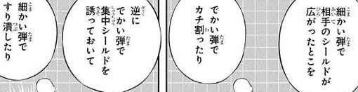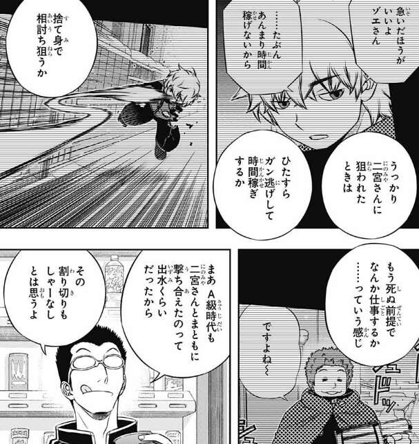三雲は自称二宮信者の里美に、二宮の強みを改めて聞くと、弓場の時と同じく「1対1(タイマン)最強」という答えが返ってきます。三雲は弓場と同じ答えではと聞きますが、里美の戦い方は二宮の戦法を弓場の技術で真似しているらしいです。二宮の戦術、細かく割った「数」重視の弾と、大きく割った「威力」重視の弾、この二つを緩急つけてフルアタックする戦術を、弓場(銃手)の技術で真似しているようです。