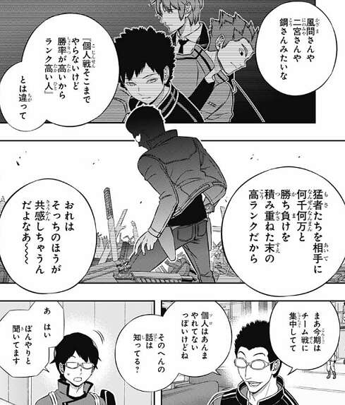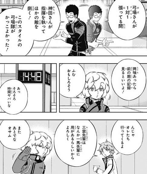 しかし神田は12月に大学受験に集中したいからとチームを辞めたましたが、神田が抜けた穴が大きく、現在順位を落としているそうです。里美から前シーズンの記録を見るとアドバイスをもらったところで、空閑は弓場に会いに行き里美と別れます。三雲は二宮の事を聞くため、里美に引き続き話を聞きます。