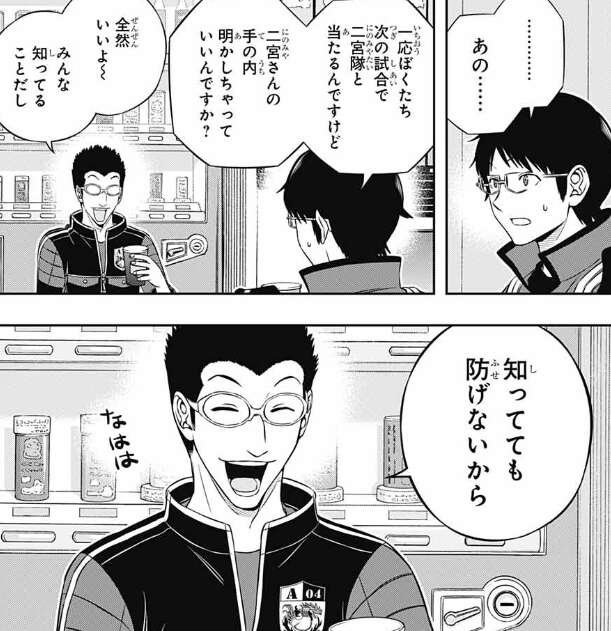 二宮の手の内をどんどん明かす里美に、次の試合で当たる自分に話していいのかと聞く真面目な三雲ですが、里美は知ってても防げないからと気にしておらず、一度捕まれば削り殺されると笑いながら話します。