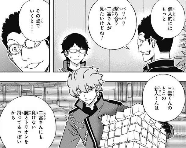 里美自身は二宮が1対1でバリバリとお撃ち合うところがみたいらしく、三雲の新人ヒュースに期待しているそうです。また三雲は「1対1(タイマン)最強」の二宮と弓場が戦ったらどっちが強いか質問しますが、普通に戦えば二宮と答えつつも、入り組んだ地形で弓場の間合いに持っていけたら弓場有利かもと話します。