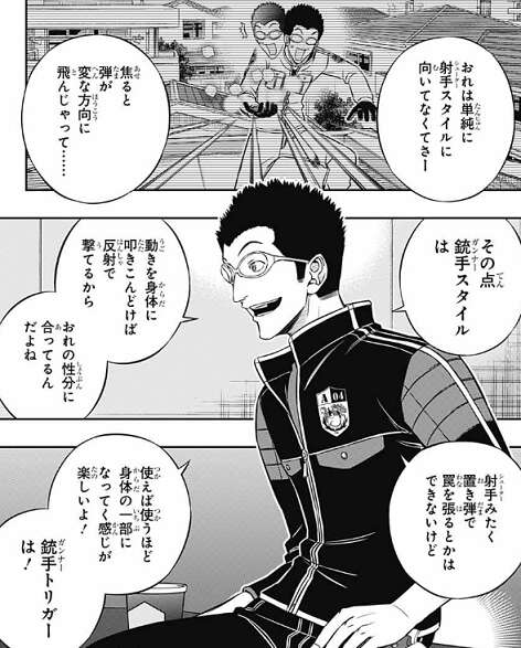三雲は里美が銃手をやっている理由を聞くと、里美自身は単純に射手スタイルに向いていないと思っていて、銃手スタイルは動きを体に叩き込んどけば反射で撃て、里美の性分に合っているからだそうです。興味があれば三雲にも銃手をレクチャーすると、銃手に勧誘し二人の話は終わります。