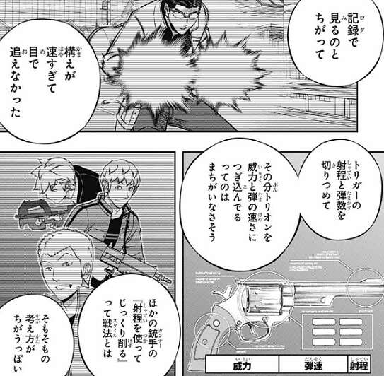 空閑が見た弓場の早撃ちはトリガーの射程と弾数を切りつめて、その分トリオンを威力と弾の速さにつぎ込んでいると空閑は分析します。他の銃手の「射程を使ってじっくり削る」という戦法と違い、1対1の近距離が得意そうです。今回空閑があっさりやられたのも、弓場が一番得意なシチュエーションだったからという可能性があると三雲は分析します。空閑は弓場対策として、分厚い壁で攻撃を防いで弾切れを狙うか、ワイヤーで相手の足を鈍らせる、弓場の射程の外で戦う、という対策を話します。
