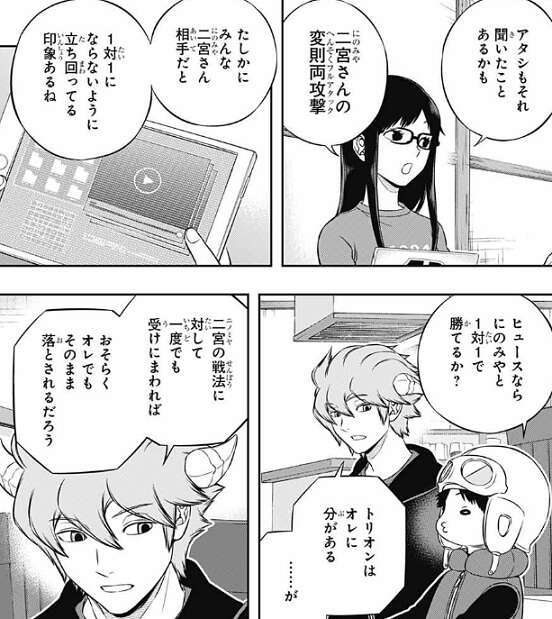 続いて三雲がガンナー個人ランク1位 里美から聞いた二宮の情報です。二宮が1対1での得意戦法、変則フルアタックについて話し、ヒュースも過去の記憶で見たと言います。ヒュースは自分が1対1になった場合、トリオンで分があっても一度でも二宮の戦法に対して受けにまわれば、落とされてしまうだろうと分析します。